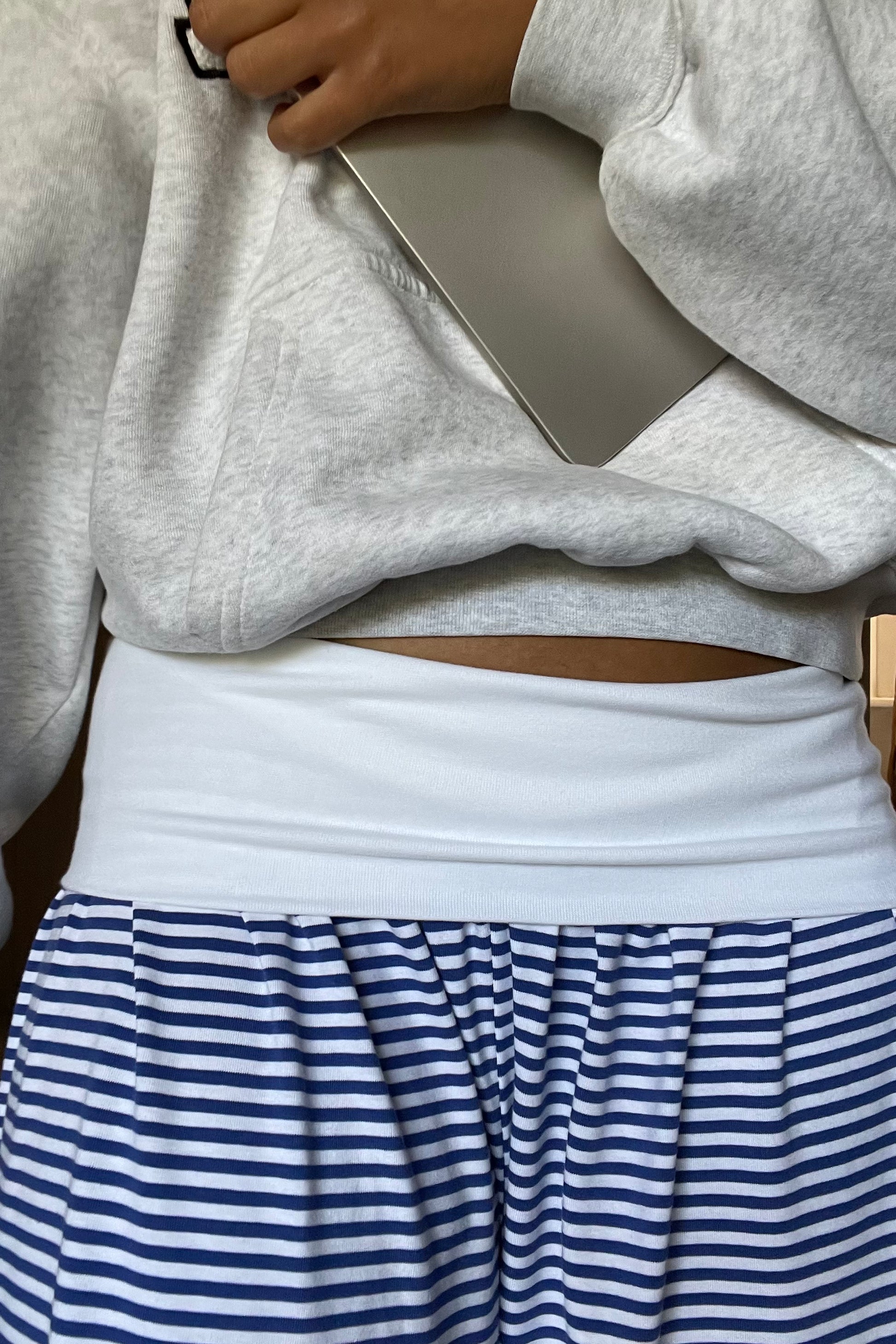 The trousers you will reach for every day — breathable and designed for movement. Meet the sister to our signature silk trousers, now in fresh blue stripes. Crafted from soft cotton, these Tabitha trousers are designed to be lived in, whether you are lounging at home or heading to campus. Cut in a flattering silhouette, they feature a relaxed fit through the leg, a subtle bootcut flare, and a hem that adds just the right amount of edge. Now available in four lengths.